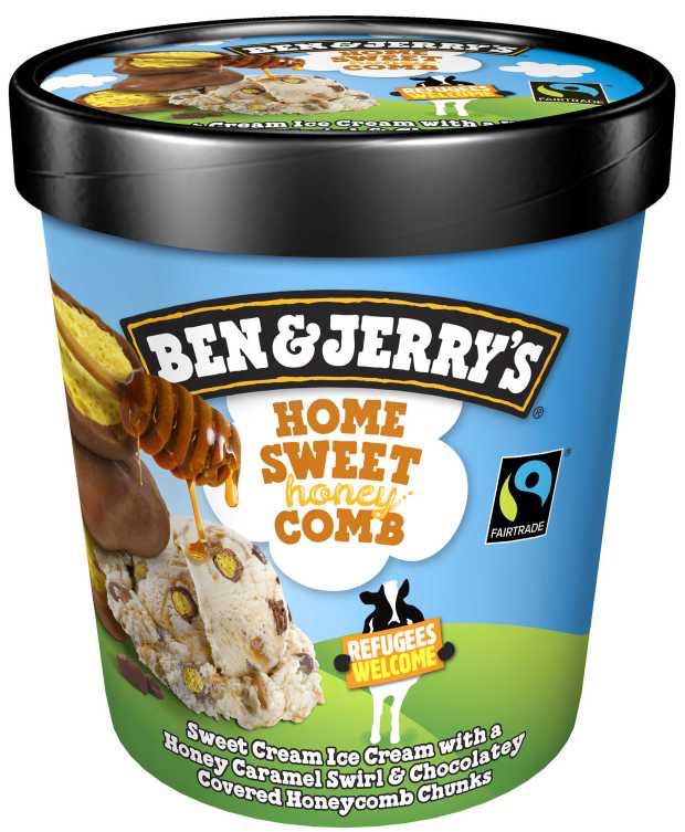 En effet, pour consolider sa clientèle de riches snobinards, B & J s’est lancé dans la sortie de trois saveurs végétaliennes et non laitières au Royaume-Uni et en Amérique : Brownie au fudge au chocolat, Chunky Monkey (bananes et noix) et Peanut Butter & Cookies (beurre de cacahouète et biscuit). Mais ce n’est pas tout. Une nouvelle saveur « normale » a été créée : Home Sweet Honeycomb, à base de miel et de chocolat. Or, si on en croit l’annonce publicitaire de cette multinationale :