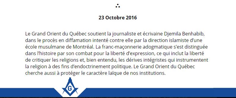 Un communiqué du Grand Orient de France, daté de janvier 2017, a plutôt passé inaperçu au Québec. Le Grand Orient de France – une, sinon la plus grande obédience maçonnique du monde -, réaffirmait son soutien à « l’auteure » (on aurait préféré que ce soit plutôt l’Académie française qui lui offre des cours de langue française) algérienne Djemila Benhabib, celle-là même qui réclamait le retrait du crucifix de l’assemblée nationale (2012).